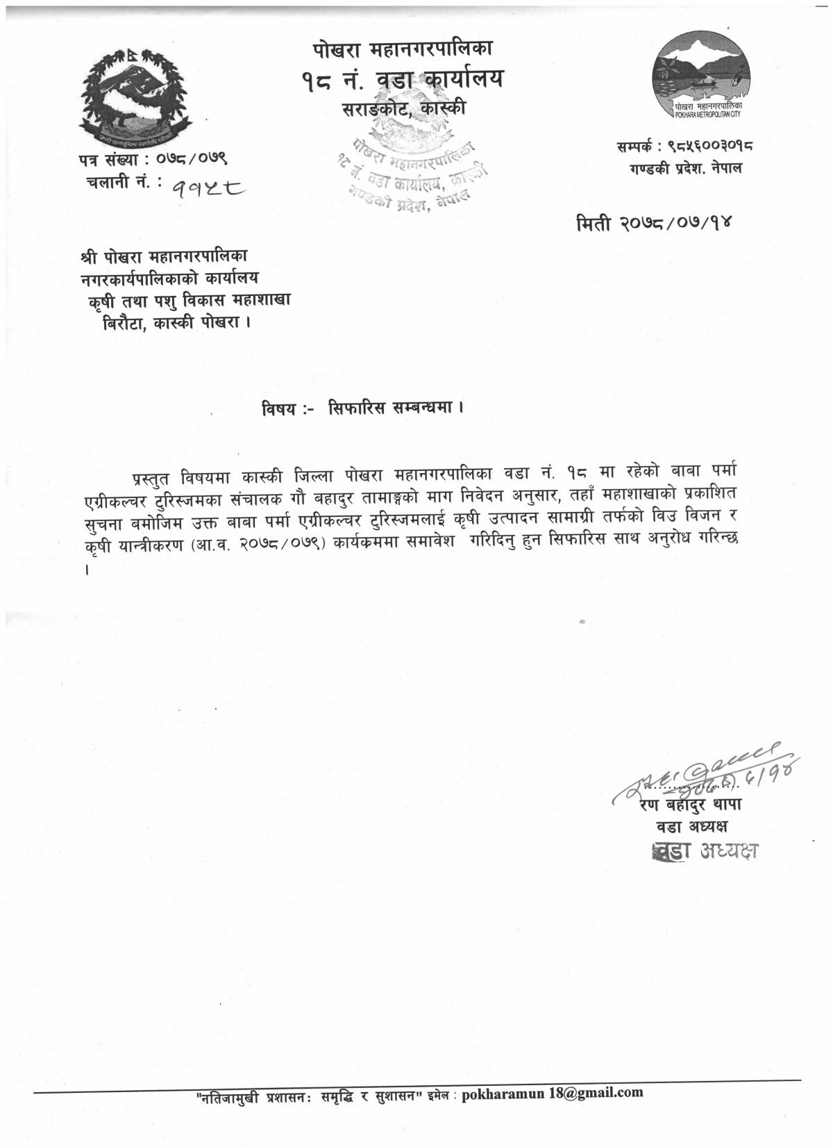 माथि उल्लेखित विवरण सत्य तथ्य छ, सोही प्रकारको कार्यक्रम बिगतमा अन्य निकायबाट प्राप्त नगरेको स्वघोषणा गर्दछु / गर्दर्छौ |