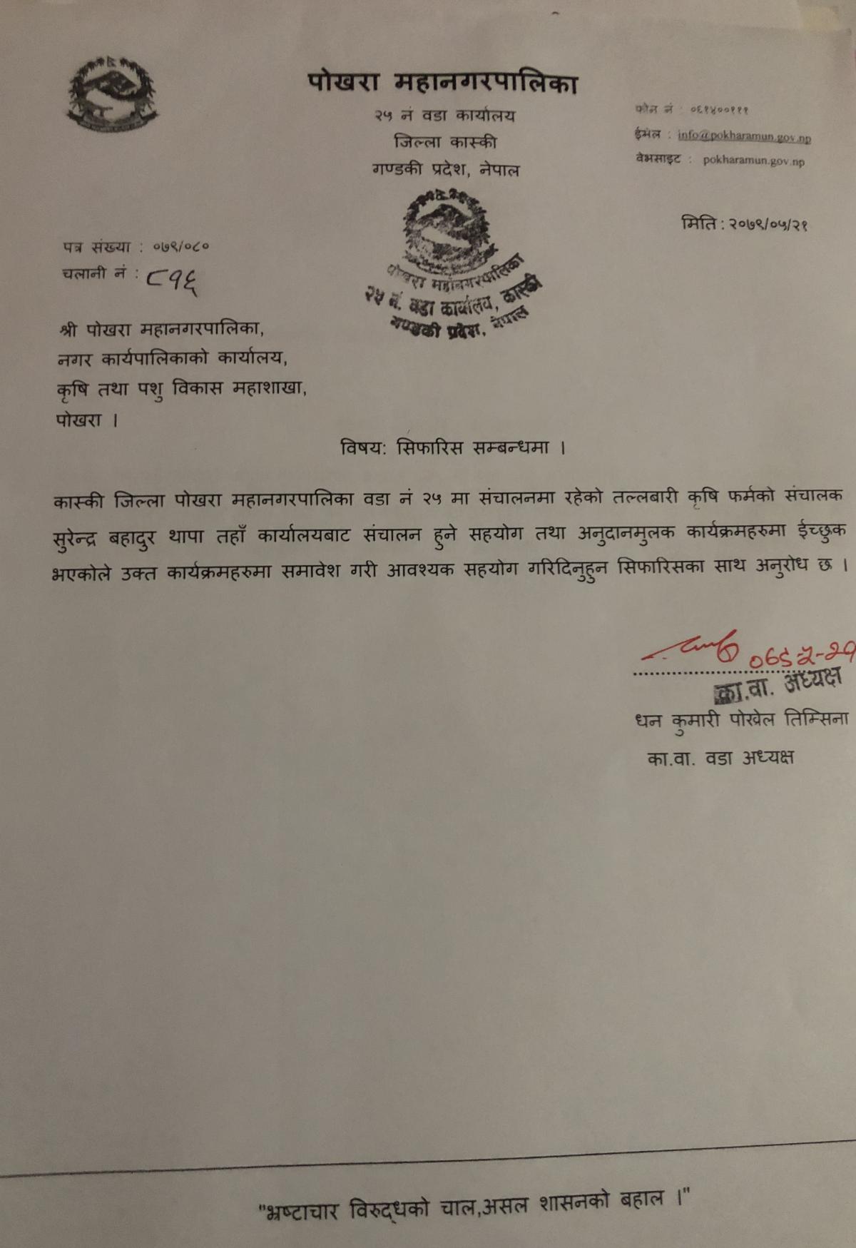 माथि उल्लेखित विवरण सत्य तथ्य छ, सोही प्रकारको कार्यक्रम बिगतमा अन्य निकायबाट प्राप्त नगरेको स्वघोषणा गर्दछु / गर्दर्छौ |
