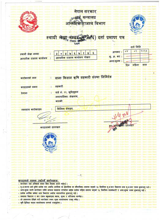 स्थायी लेखा नम्बर (PAN / VAT) को दर्ता प्रमाणपत्र: