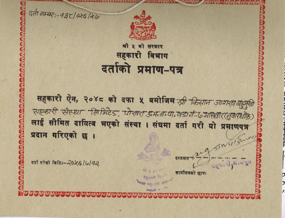 सहकारी संस्था, फर्म वा कम्पनी दर्ताको प्रमाणपत्र: