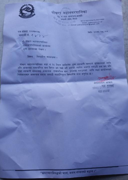 सम्बन्धित वडा कार्यालयको सिफारिस: