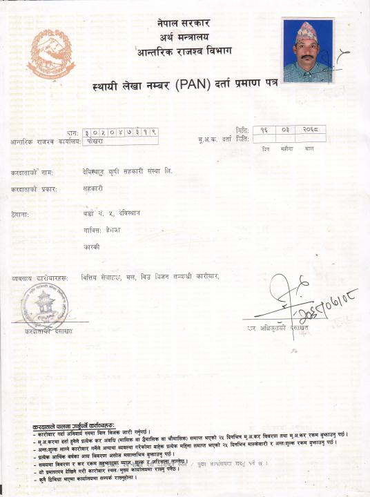 स्थायी लेखा नम्बर (PAN / VAT) को दर्ता प्रमाणपत्र: