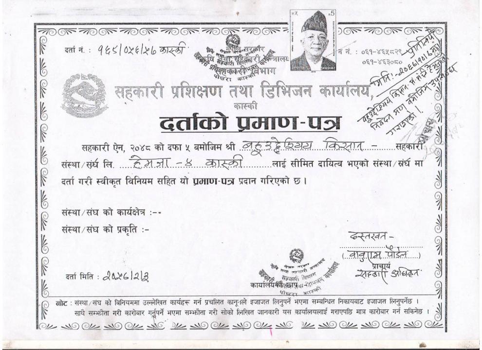 सहकारी संस्था, फर्म वा कम्पनी दर्ताको प्रमाणपत्र: